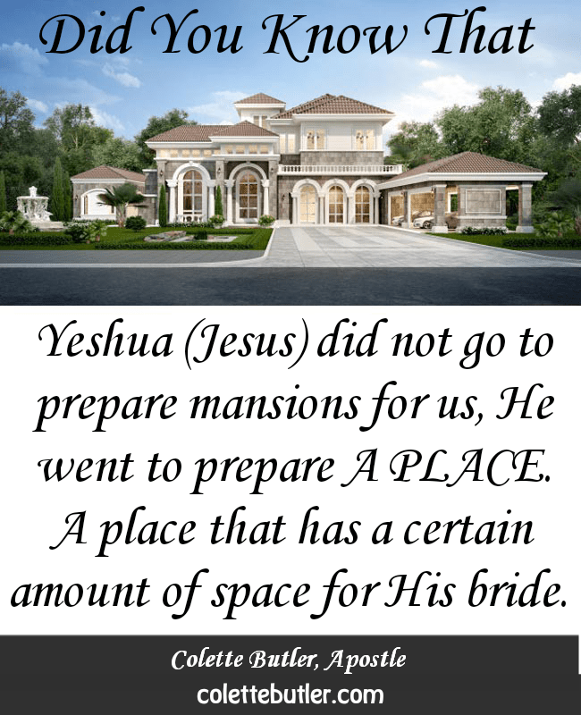 So we are not limited to receiving a mansion from Yeshua, but we will have access to all mansions in eternity. Whatever access Yeshua has we will have access, wherever He goes, we will be found with Him. Therefore we don’t have to look forward to receiving a mansion but look forward to having access to ALL that GOD has for us.