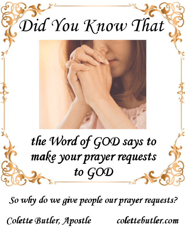 Also in Philippians the Word clearly directs us to make our requests known to GOD. The scripture says, “Be careful for nothing; but in every thing by prayer and supplication with thanksgiving let YOUR REQUESTS be made known unto God.” This will give you the peace of GOD.
